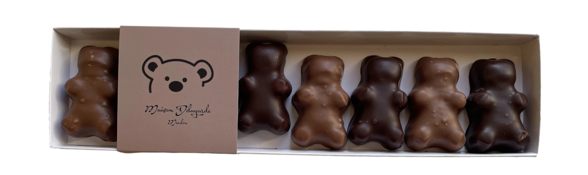 Au chocolat noir, au chocolat au lait …. Dégustez nos oursons entièrement fabriqués maison dans notre atelier de Meudon.